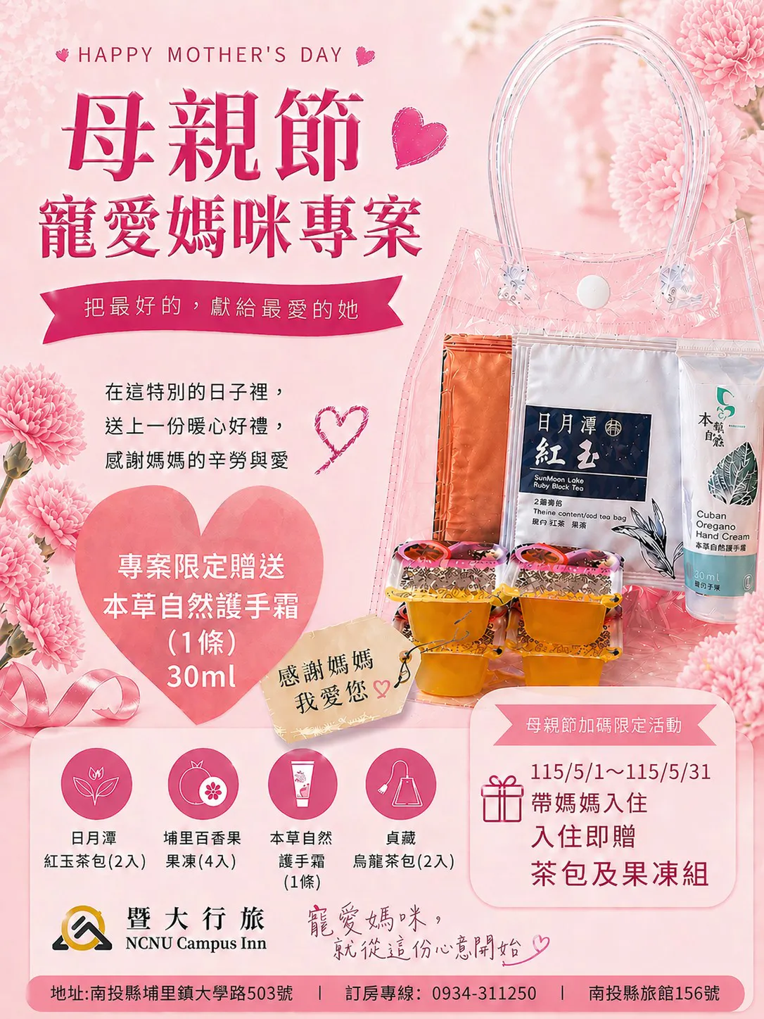 ◎不限專案,凡於5/1-5/31 帶媽媽一起入住,主動告知櫃台服務人員,每房將特別贈送媽媽一份精緻的在地小禮:日月潭紅茶包2、鹿谷烏龍茶包2以及百香果果凍4入。(每間房限贈送一份)(贈品依現場實物為主)